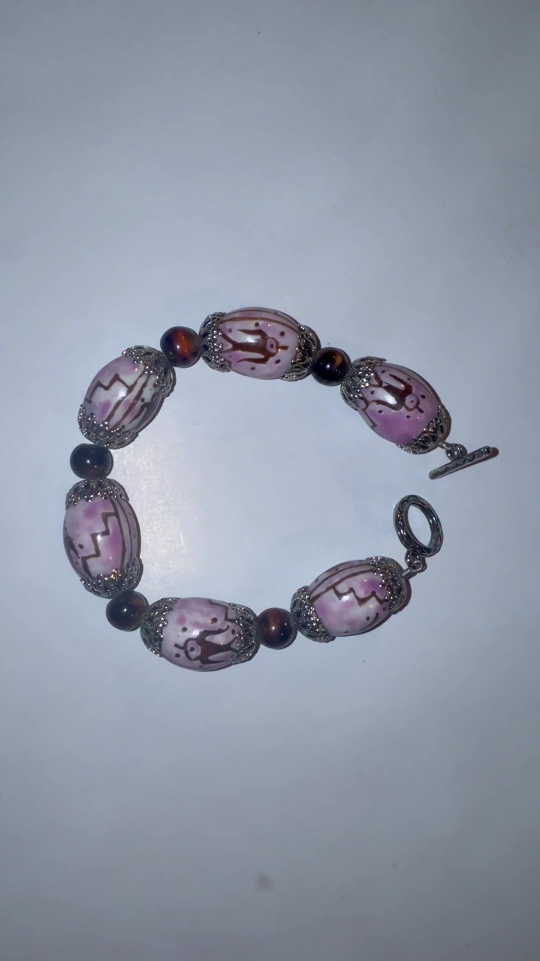 A tribal hand-painted, beaded toggle bracelet. Features: • hand-painted • beaded • toggle clasp ───────────────────────────────── Detailed Description (auto-generated): Introducing the Tribal Hand-Painted Beaded Toggle Bracelet — a wearable piece of art that marries bold tribal motifs with delicate craftsmanship. This bracelet is designed to be a statement accessory, perfect for adding a touch of bohemian elegance to any outfit. Its toggle clasp ensures effortless wear, while its intricate design invites admiration and conversation, making it ideal for both casual and curated looks. Crafted with a series of hand-painted, oval-shaped beads in a soft, luminous lavender hue, each piece is adorned with detailed geometric patterns in earthy tones of brown and silver. These beads are interspersed with small, glossy black accent beads and framed by ornate silver-toned metal caps, enhancing the bracelet’s tribal aesthetic. The toggle clasp, also finished in a brushed silver tone, complements the metallic accents and provides a sturdy, secure closure. The overall style evokes a fusion of modern boho and traditional tribal artistry — rich in texture and color, it’s equally at home at a music festival, a gallery opening, or as a standout addition to your everyday ensemble. The hand-painted details and carefully assembled components speak to a unique, artisanal touch that transforms this bracelet into a one-of-a-kind accessory.