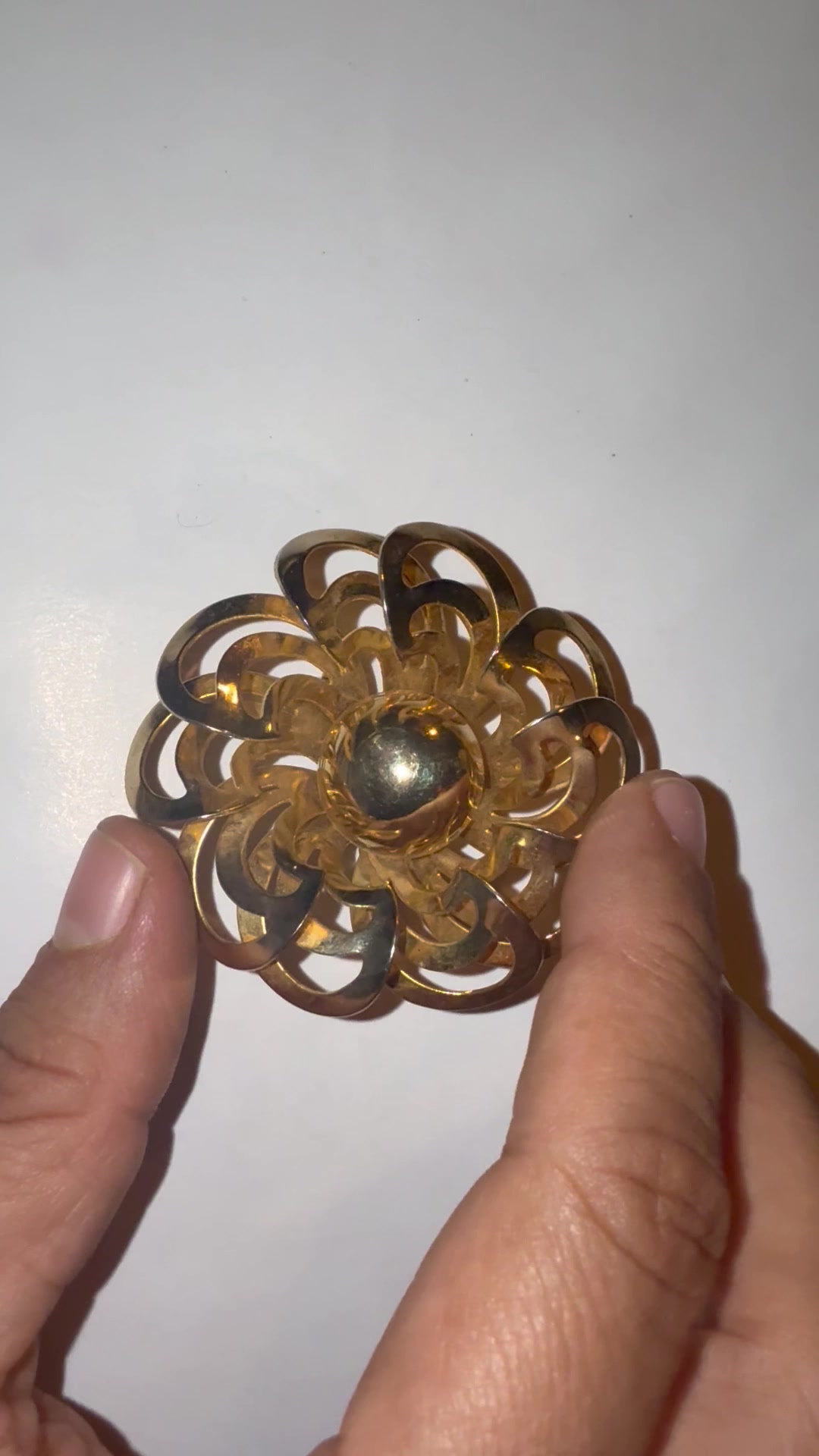 A vintage flower brooch. Features: • vintage • flower design ───────────────────────────────── Detailed Description (auto-generated): Introducing the Vintage Flower Brooch — a timeless piece of wearable art designed to add a touch of classic elegance to any ensemble. This brooch is a statement-making floral pin, crafted with intricate, layered petals that form a lush, dimensional bloom. Held gently between fingers, its substantial size and detailed construction are immediately apparent, making it a perfect accessory for adding vintage flair to blazers, lapels, or even as a decorative accent on a handbag. Visually, the brooch features a warm, translucent amber hue with a subtle gradient, giving it a luminous, almost resin-like quality. The petals are formed from what appears to be polished, gold-toned metal, each one delicately curved and overlapping to create a rich, textured flower. At the center, a small, metallic disc serves as the focal point, adding a touch of refined contrast. The piece exudes an unmistakable mid-century aesthetic — elegant, sophisticated, and effortlessly chic. Its craftsmanship shines through in the precision of the layered petals and the smooth finish, making it ideal for elevating both casual and formal attire. Wear it to a gallery opening, a wedding, or simply to brighten your everyday look — it’s a piece that turns heads and whispers stories of vintage glamour.